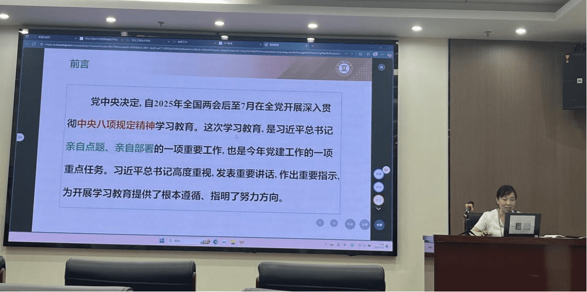 为深入贯彻落实“中央八项规定精神”的重要论述精神,扎实推进学校党委部署要求落地见效,公共教育学院党支部于2025年7月2日(星期三)上午9:30在会议中心第一会议室召开中央八项规定精神专题学习研讨会。党支部书记李小敏主持会议并作专题解析,支部委员及本支部的全体党员全程参与学习记录。